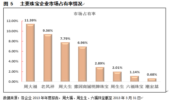 据各公司年报数据测算,针对中国内地销售情况,2013年珠宝行业结构呈现寡头垄断态势。行业前四强分别为周大福、老凤祥、周大生以及豫园商城,占据行业35.50%的份额。其中周大福11.39%、老凤祥9.36%、周大生7.79%以及豫园商城6.96%。其次,明牌、周生生、六福以及潮宏基内地市场份额分别为2.89%、2.01%、1.14%及0.68%,市场份额相对较少。